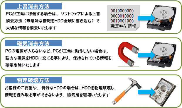 お使いになられた情報機器のハードディスクには、個人情報や大切な企業情報など、多くの情報が記録されており、万一情報流出した場合、企業は莫大な損害を被ります。
