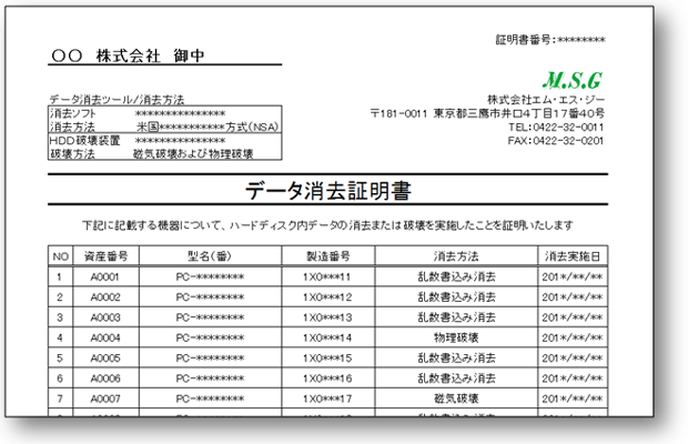 弊社では、お客様に代わりHDDのデータ消去作業を行い、情報漏洩のリスクを“消去”いたします。 消去作業を実施した際は、“データ消去証明書”を発行。消去結果をご報告いたします